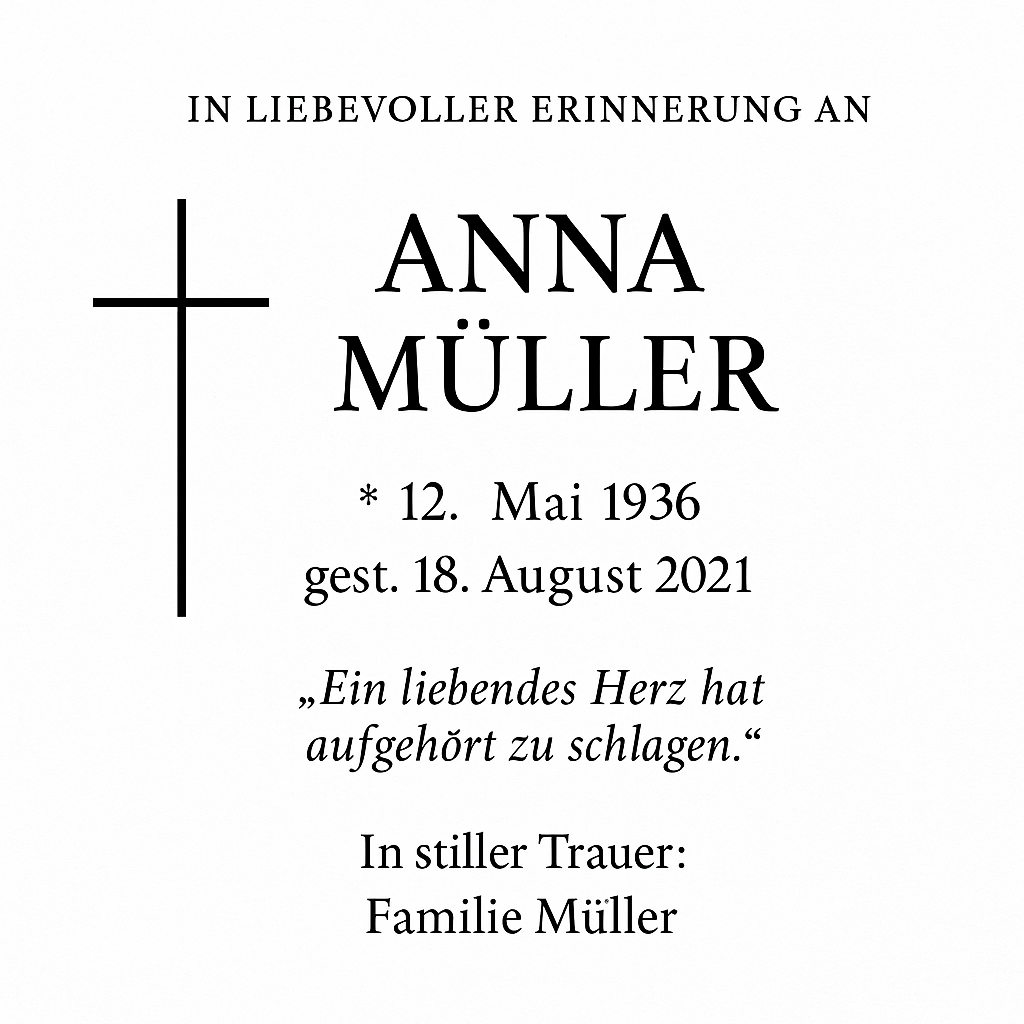 dieser text wird ebenfalls im Profil ausgefüllt und hier ausgegeben: (Anna Müller war eine warmherzige, humorvolle Frau, die ihre Familie stets an erste Stelle setzte. Sie liebte ihren Garten, kochte leidenschaftlich für ihre Kinder und Enkel und war für ihre Geduld und ihre Geschichten bekannt.)